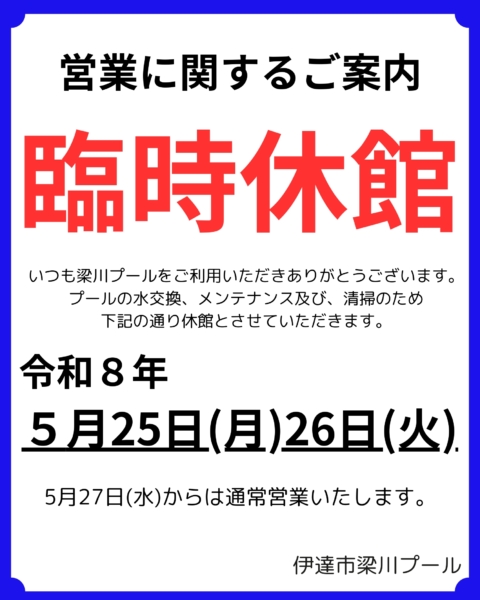 ホーム > お知らせ > 公社のお知らせ > 梁川プール 臨時休館のお知らせ
